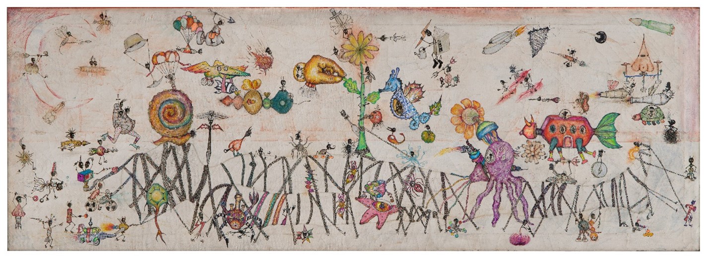 Inspired by the adventure story of “Gulliver’s Travels”, one’s attention is immediately drawn to the colourful figures of little viruses, animals and machineries plaguing a human body. Drawn in pen ink, the human silhouette remains barely visible, made prominent only by the ropes tying him down. Mr Hiah shared, “Gulliver’s Travels is a familiar story to most. I wanted to use this iconic scene to portray a haunting yet fairytale-like scene of a lockdown, akin to the restraints and helplessness felt by humankind during the pandemic.”