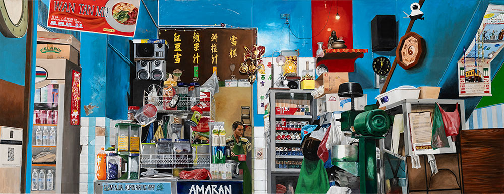 Crafted using diptych, “A Sip Through Time” captures a coffee shop frozen in time, boasting an eclectic mix of objects, posters, clocks, traditional sweets and other items commonly seen in traditional coffee shops. The inclusion of a QR code and surveillance camera merges the traditional and digital worlds, hinting at progressiveness. Through the artwork, the artist hopes to convey positive emotions of days past, transporting viewers back in time to simpler and slower moments.