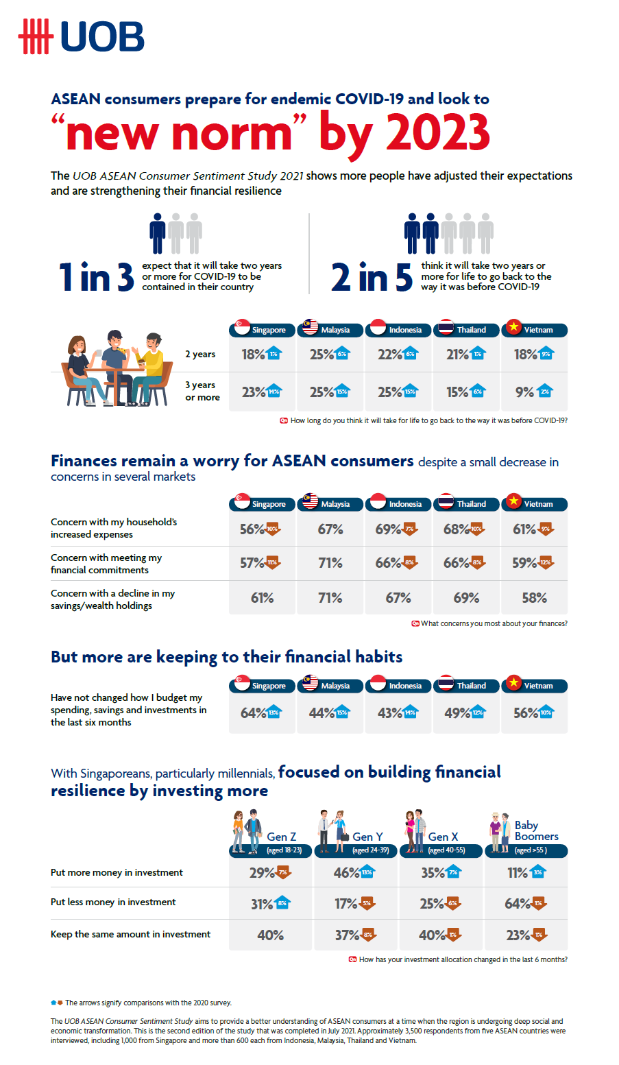 Amid the protracted COVID-19 pandemic, ASEAN consumers have learned to grapple with constant changes in social distancing rules and are preparing themselves to live with a “new norm” of endemic COVID-19 by 2023. This was among the key findings from the latest UOB ASEAN Consumer Sentiment Study 2021 released today.