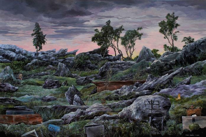 Isolated Garden depicts the solitude Mr Perdana experienced during the pandemic with his studio represented as an open garden without walls and only his personal belongings for company. He based his painting on the Stone Garden in the highlands of Bandung in West Java.