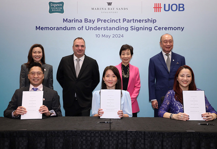 Singapore (10 May 2024) – Marina Bay Sands, UOB and Singapore Tourism Board (STB) inked a Memorandum of Understanding (MoU) today, committing to drive awareness and strengthen visitorship to the Marina Bay precinct. This anchors the tripartite partners’ long-term vision to enhance the precinct into a leading premium lifestyle and business hub, drawing locals and visitors alike. It builds on an earlier first-of-its-kind partnership between the three organisations in the first quarter of the year (January to March 2024), which enlivened the precinct through strong programming and compelling events.