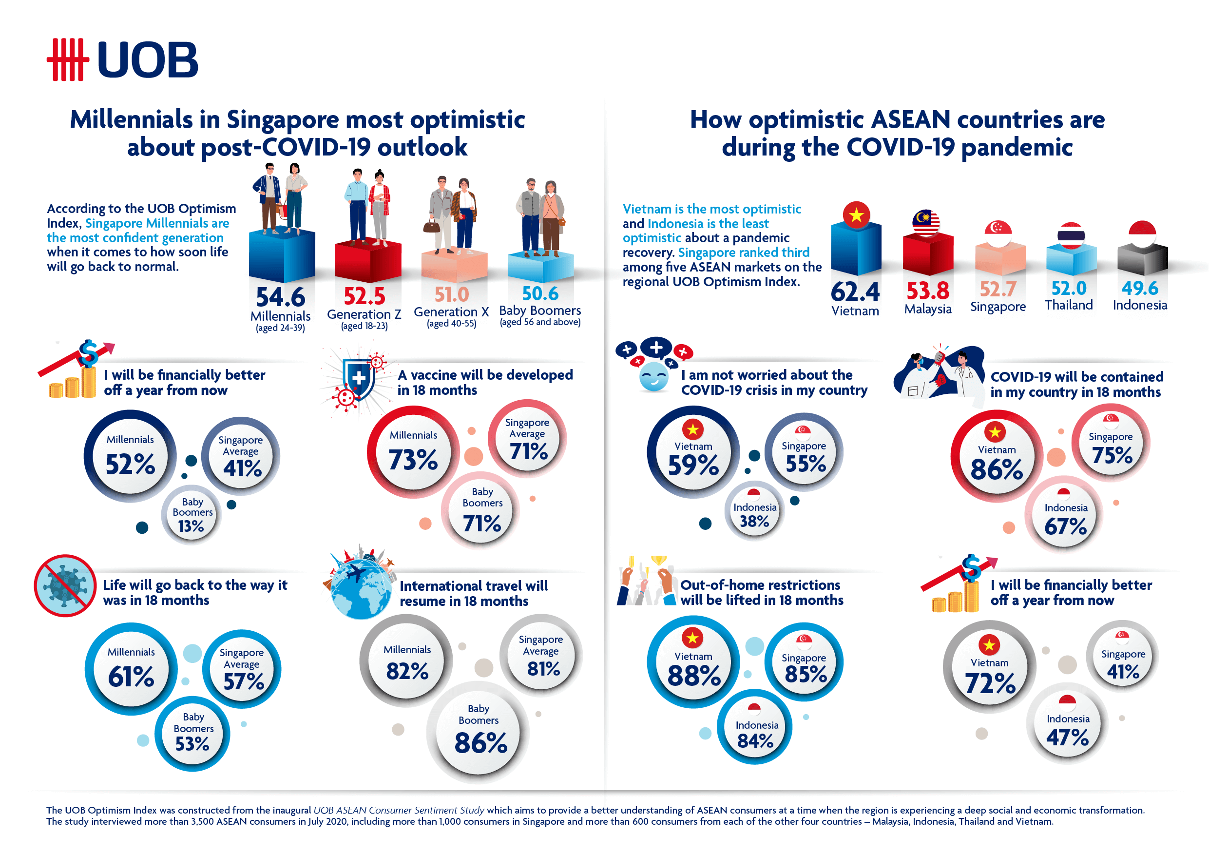 The UOB Optimism Index was derived from the Bank’s UOB ASEAN Consumer Sentiment Study, which aims to provide a better understanding of ASEAN consumers at a time when the region is undergoing deep social and economic transformation. For the study’s inaugural run in July 2020, more than 3,500 respondents from five ASEAN countries were interviewed, including 1,000 from Singapore and more than 600 each from Indonesia, Malaysia, Thailand and Vietnam.