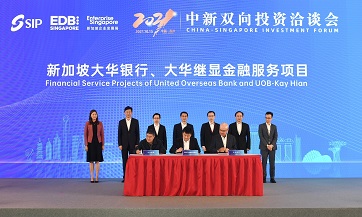 Suzhou Industrial Park Administrative Committee (SIPAC), UOB (China) Limited (UOB China) and UOB Kay Hian Pte Ltd. (UOB Kay Hian) today signed a Memorandum of Understanding (MOU) at the China-Singapore Investment Forum. Under the MOU, the three parties aim to provide innovative cross-border investment, financing and trade solutions, including green financing to businesses in key focus areas actively promoted by the Suzhou Industrial Park (SIP). These areas include telecommunications technology, biomedicine, high-end manufacturing.