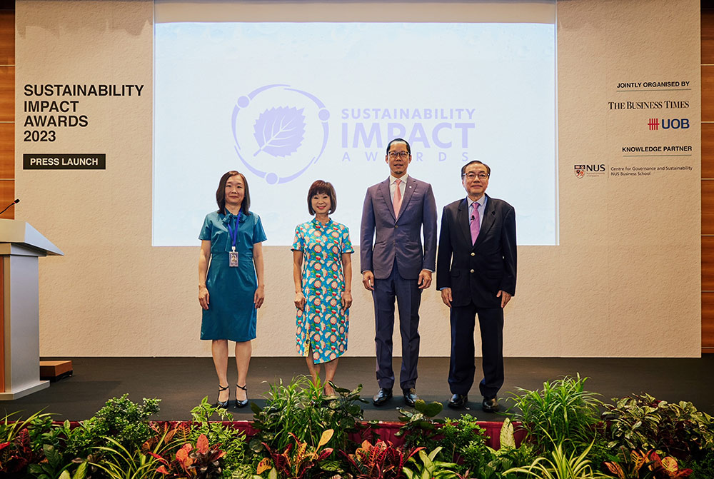 Mr Eric Lim (second from right), Chief Sustainability Officer at UOB, with Dr Amy Khor (second from left), Senior Minister of State for Sustainability and the Environment, Ms Chen Huifen (extreme left), Editor of The Business Times and Professor Lawrence Loh (extreme right), Director of CGS at NUS Business School, witnessing the launch of the Sustainability Impact Awards logo.