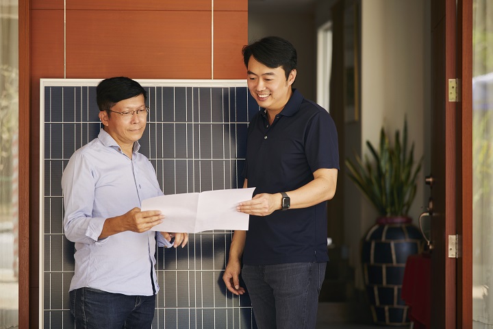 (From L to R) Mr Albert Lim, Managing Director, SolarGy, a partner of UOB’s U-solar programme guides Mr Chong Chieh Tseng, a home owner, on the solar panel installation process.