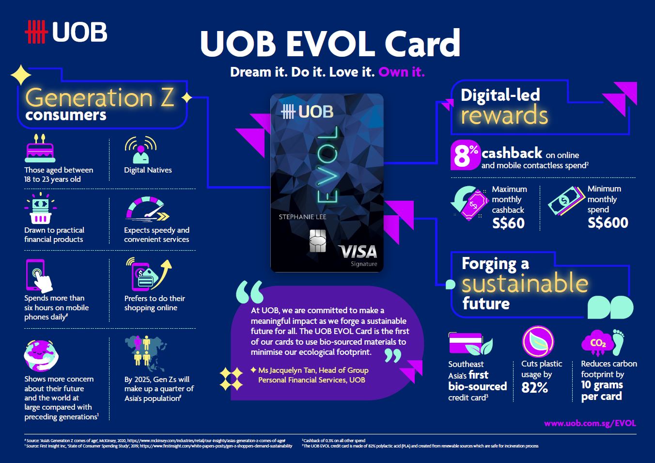 In anticipation of the increased spending power of Generation Z consumers (Gen Zs)1 as they enter the workforce, UOB has revamped the UOB YOLO credit card2 to serve the needs of Gen Zs across ASEAN. To signify the change in generations, the UOB YOLO credit card has been renamed the UOB EVOL Card, a name which was chosen by the Bank’s Gen Z customers3.