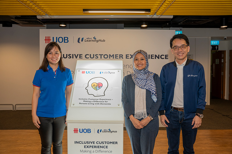 Singapore, 9 June 2023 – UOB and NTUC LearningHub (NTUC LHUB) jointly announced today the launch of a training programme for frontline staff named the “Inclusive Customer Experience – Making a Difference for Persons Living with Dementia”. Officially launched by Senior Parliamentary Secretary, Ministry of Health and Ministry of Law, Ms Rahayu Mahzam, it is the first service inclusiveness training programme in Singapore to equip frontline banking employees with the skills on how to interact with persons living with dementia, identify the needs of caregivers, as well as use their knowledge of available resources to support caregivers looking after their loved ones.